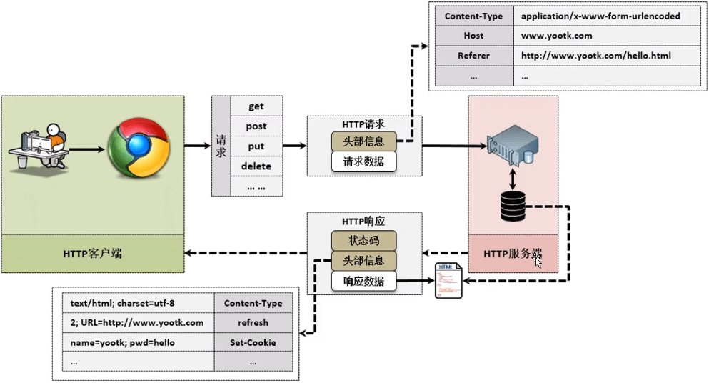 HTTP(Hyper Text Transfer Protocol、超文本传输协议)是一种应用在www万维网(World Wide web)上实现数据传输的一种数据交互协议。客户端基于浏览器向服务端发送HTTP服务请求,服务端会根据用户的请求进行数据文件的加载,并将要回应的数据信息一HTML(HyperText Markup Language、超文本标记语言)文件格式进行传输,当浏览器接收到此数据信息时就可以直接进行代码的解析并将数据信息显示给用户浏览。
