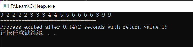 | int main(){ int tree[] = {2,3,6,2,0,9,5,3,6,2,5,6,8,3,4,6,2,4,9}; int n = 19; heap_sort(tree,n); int i = 0; for( ;i<n;i++){ printf("%d ",tree[i]); } }