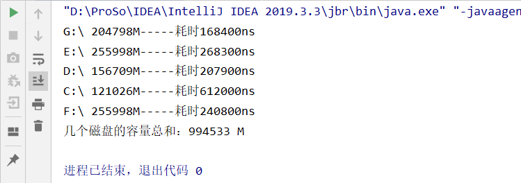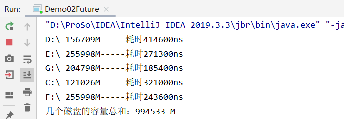 long sum = 0; for (Future<Long> future : futures) { sum += future.get(); } System.out.println("几个磁盘的容量总和:" + sum/(1024*1024) + " M"); } }