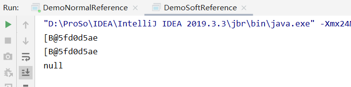 public class DemoSoftReference { public static void main(String[] args) { SoftReference<byte[]> m = new SoftReference<>(new byte[1024*1024*10]); System.out.println(m.get()); System.gc(); try{ Thread.sleep(500); } catch (InterruptedException e) { e.printStackTrace(); } System.out.println(m.get());