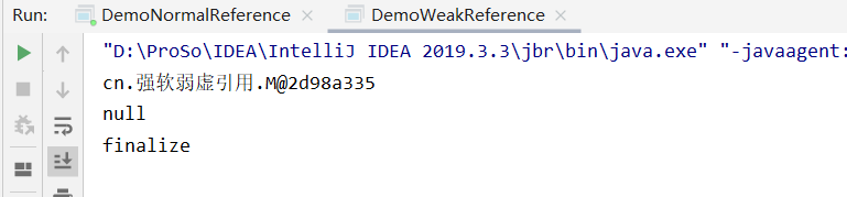 | public class DemoWeakReference { public static void main(String[] args) { WeakReference<M> m = new WeakReference<>(new M()); System.out.println(m.get()); System.gc(); System.out.println(m.get()); } }