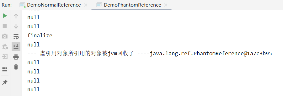- 虚引用根本就不像是一个引用,无论什么情况get()方法的返回值都是一个null